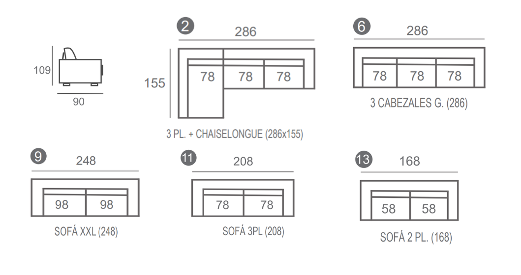 Disponible en chaiselongue, sofá, rinconera y chaiselongue terminal.
