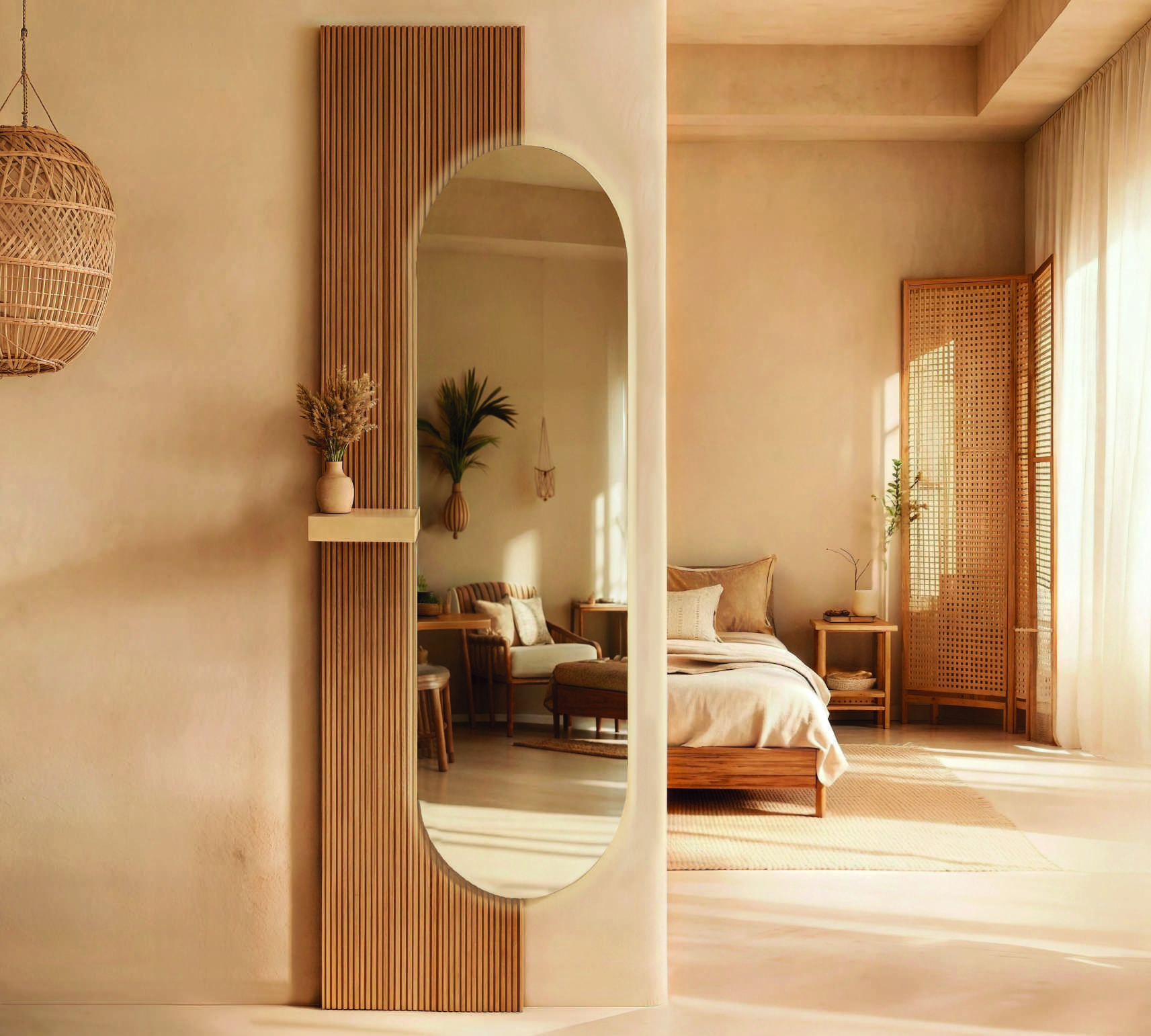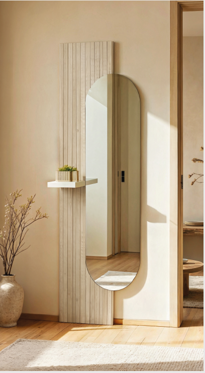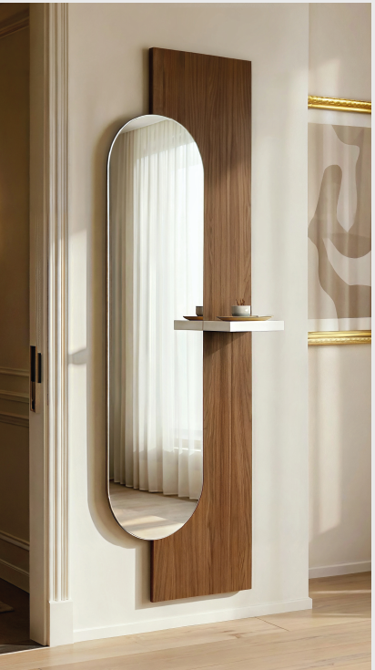 La entrada Nube muestra una composición de diseño interior que incorpora un gran espejo ovalado de cuerpo entero, montado sobre un panel de madera clara y un elemento de estantería integrada para colocar pequeños objetos decorativos. El espejo tiene forma ovalada estilizada, ideal para ampliar visualmente espacios cómo dormitorios ó recibidores. OPCIÓN ILUMINACIÓN LED